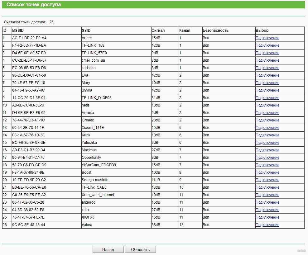 После подключения любого беспроводного устройства (ноутбук, телефон, планшет) к Wi-Fi сети проверим, что устройство подключилось именно к репитеру, а не к роутеру. Для этого на точке доступа открываем меню Беспроводной режим — Статистика беспроводного режима и видим устройства, подключенные к репитеру TP-Link.