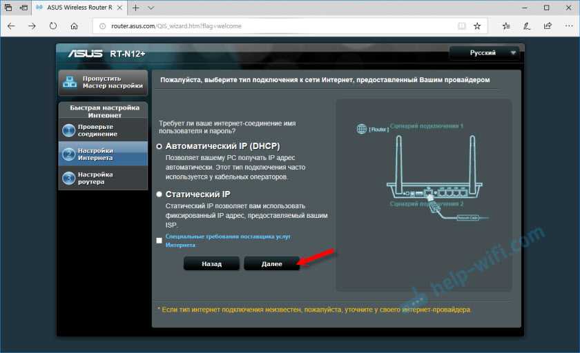 Тип подключения к интернету можно уточнить у поддержки своего интернет-провайдера. Выберите свой вариант и нажмите «Далее».