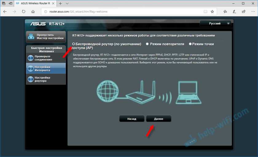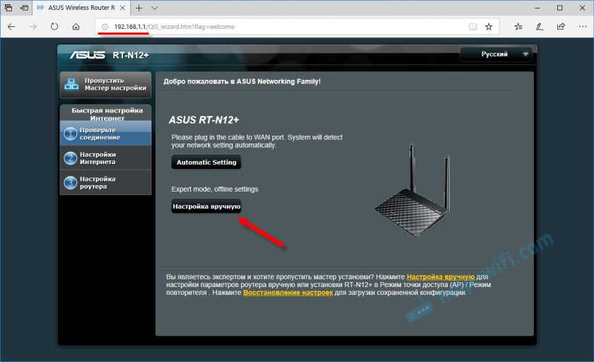 Должен появится мастер быстрой настройки (у меня модель RT-N12+, не обращайте внимания). Чтобы начать настройку с помощью мастера быстрой настройки нажмите на кнопку «Настройка вручную». Следуя подробным инструкциям можно полностью настроить свой маршрутизатор. Это как один из вариантов настройки.