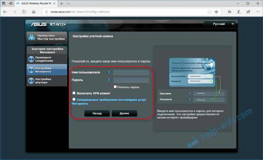 Если Asus RT-N12E не может подключится к интернету, то он будет раздавать Wi-Fi сеть без доступа к интернету. Я уже писал об этой проблеме: роутер Asus не раздает интернет по Wi-Fi сети. Проверьте все параметры в разделе «Интернет». Уточните настройки у провайдера. Возможно, ваш провайдер делает еще привязку по MAC-адресу. И нужно клонировать MAC-адрес, или прописать новый у провайдера.