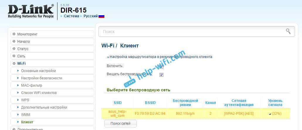 В чем-то я был прав. На D-link DIR-615 я не нашел как такового режима репитера. Но, там есть «режим клиента». Когда роутер D-link получает интернет по Wi-Fi и передает его на устройства по кабелю. Но, если в настройках режима «Клиент» включить вещание Wi-Fi сети, и на вкладке «Сеть» – «WAN» добавить подключение с интерфейсом «WiFiClient», то все работает.