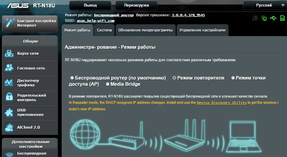 Так же все очень просто. Я настраивал на примере модели Asus RT-N12. Так же проверял на RT-N18. Вот подробная инструкция: настройка роутера Asus в качестве репитера (режим повторителя Wi-Fi сети). Помню, даже на старом роутере Asus RT-N13U B1 все отлично работало. Там режим включался отдельным переключателем на корпусе.