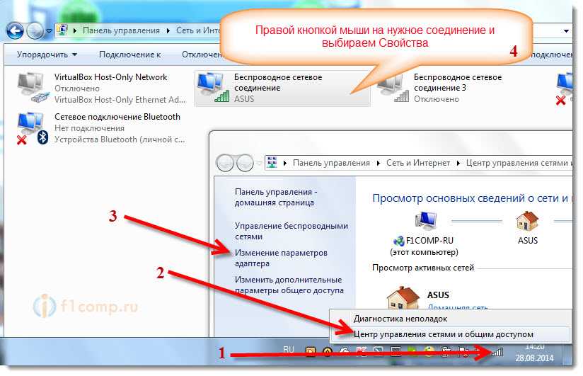 Правой кнопкой мыши на значок сети, затем выбираем пункт Центр управления сетями и общим доступом . Дальше нажимаем на Изменение параметров адаптера , и снова же правой кнопкой мыши нажимаем на адаптер, свойства которого хотим изменить. В меню выбираем Свойства . Вот так: