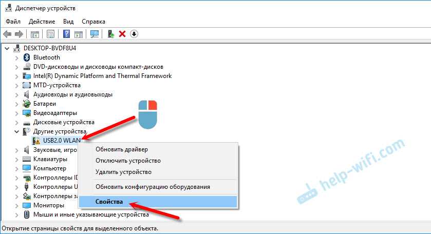 В диспетчере устройств откройте свойства USB2.0 WLAN, Сетевого контроллера, или другого неизвестного устройства.
