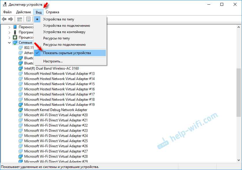 Можно нажать на «Вид» и поставить галочку возле «Показывать скрытые устройства». После этого появляться все отключенные адаптеры, которые раньше были подключены и настроены.
