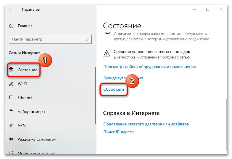 Оставаясь на вкладке «Состояние» на панели слева, пролистайте главную часть окна до строки «Сброс сети» и нажмите на нее.