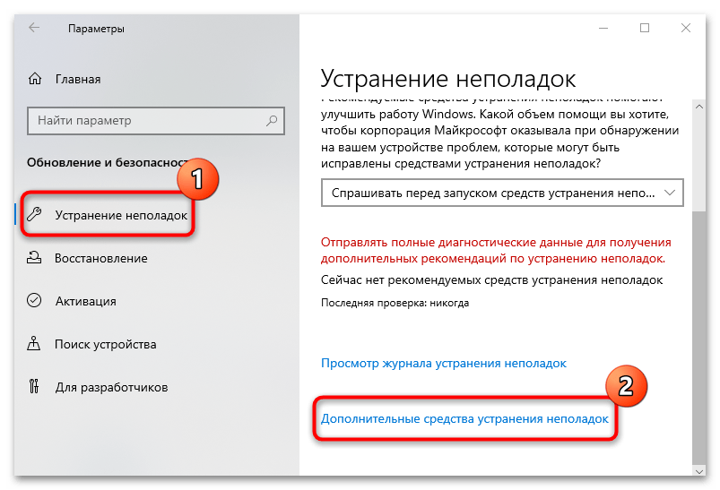 На панели слева выберите «Устранение неполадок», затем щелкните по строке «Дополнительные средства устранения неполадок».