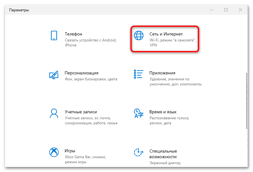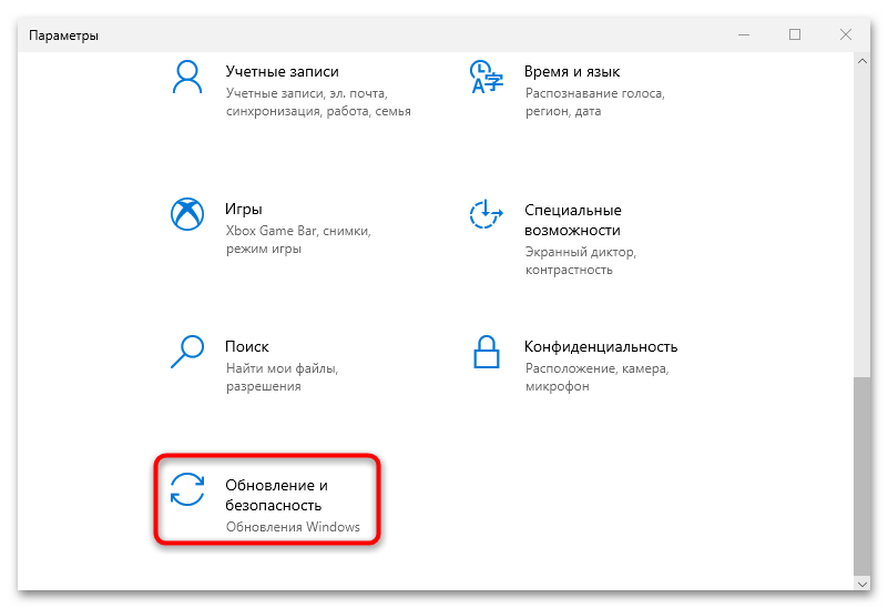 - Через системные «Параметры» перейдите в раздел «Обновление и безопасность».