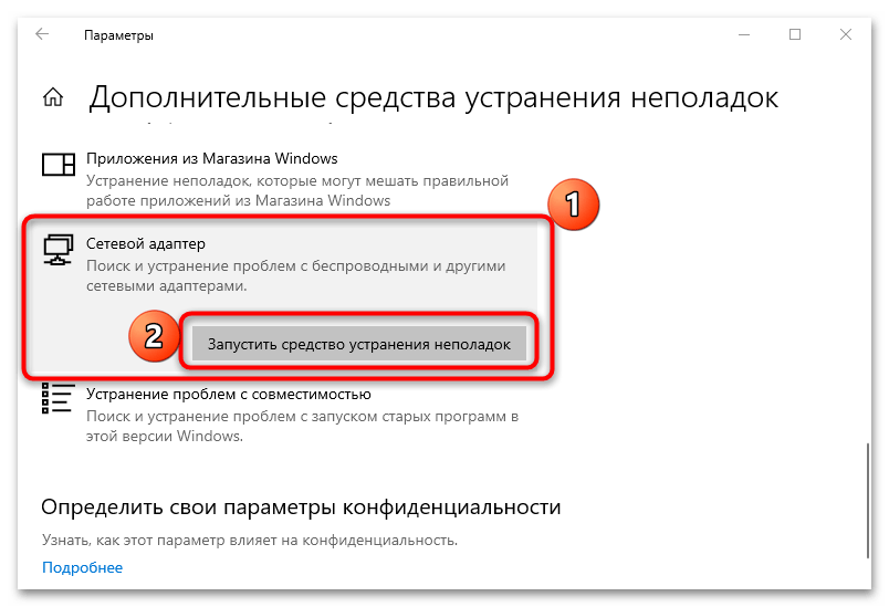 В появившемся списке отыщите «Сетевой адаптер» и кликните по нему левой кнопкой мыши, чтобы появилась кнопка, запускающая средство устранения неполадок.