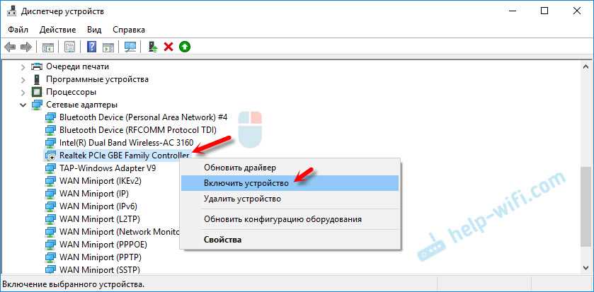В списке могут быть и дополнительные адаптеры. Выберите нужный и, кликнув по нему правой клавишей мыши, выберите функцию «Включить». Дождитесь окончания активации: значок в виде красного крестика на иконке карты должен исчезнуть. Кликаем по кнопке «Включить» для активации адаптера