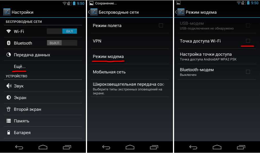 Если в шторке уведомлений смартфона отсутствуют данные значки, то их можно найти в меню настроек андроида. После выполнения этих простых шагов в меню ноутбука «Беспроводные сети» появится новая точка доступа с заданным именем. Подключившись к ней и введя при необходимости пароль, вы можете свободно пользоваться интернетом.