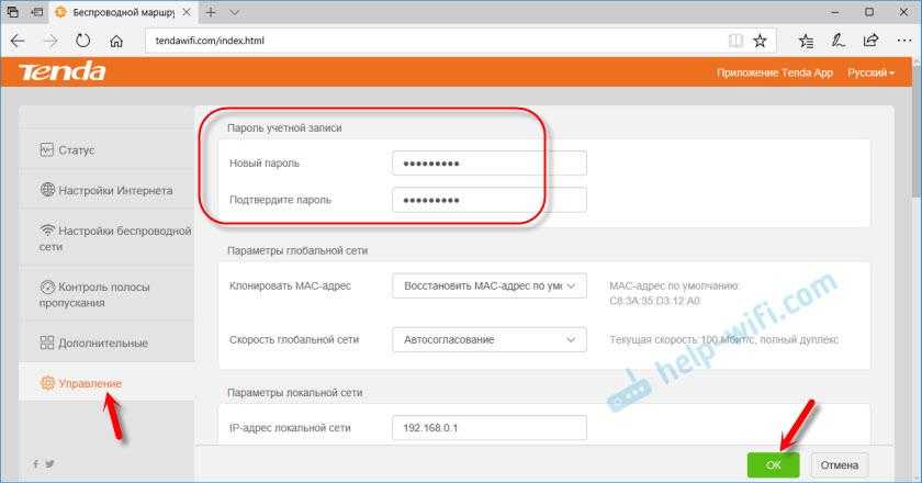 После того, как роутер настроен, рекомендуется сменить пароль к странице настройки маршрутизатора. Нужно открыть раздел «Управление» и дважды ввести новое кодовое слово в строках «Новый пароль» и «Подтвердите пароль».