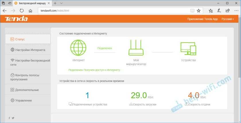 Управлять Tenda F9 с помощью приложения можно только при работе устройства в режиме маршрутизатора. Доступны все те же настройки, что и в веб-интерфейсе роутера.