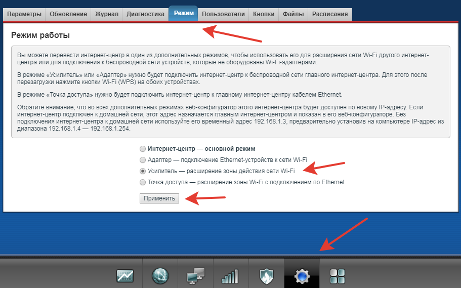 В роутерах Zyxel нужно зайти во вкладку «Система» и выбрать там пункт «Режим». Здесь ставим галочку в пункте «Усилитель — Расширение зоны Wi-Fi», сохраняем настройки и перезагружаем устройство.