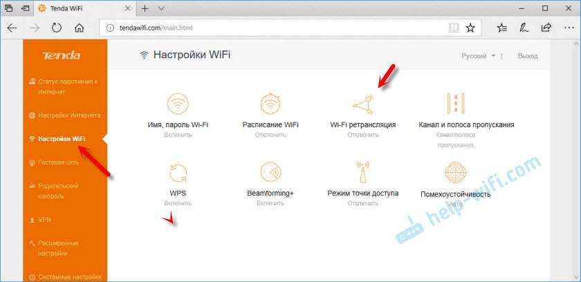 Сразу открываем раздел «Настройки WiFi» – «Wi-Fi ретрансляция».