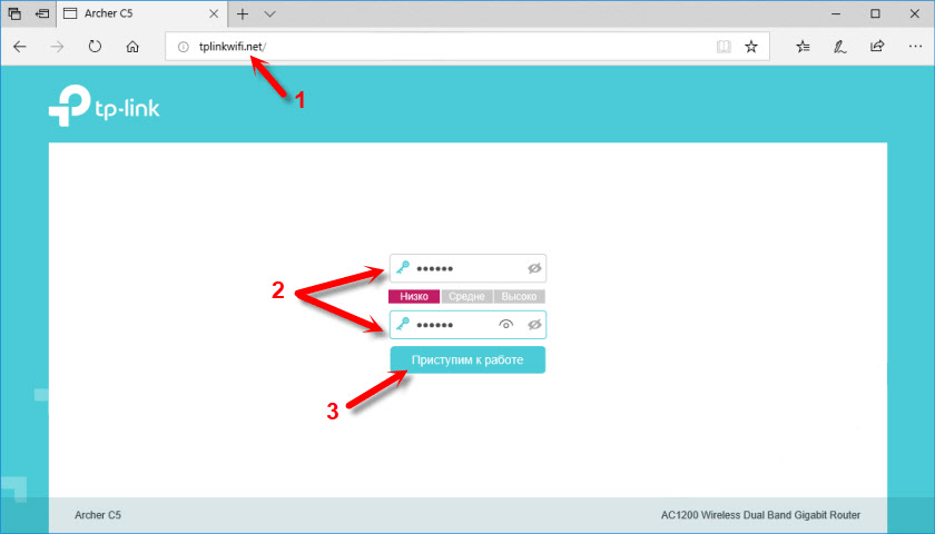 Если же он еще не настраивался, то появится окно, в котором нужно придумать и указать пароль. Этот пароль в дальнейшем будет использоваться для авторизации в настройках TP-Link Archer C5, нажмите Приступить к работе