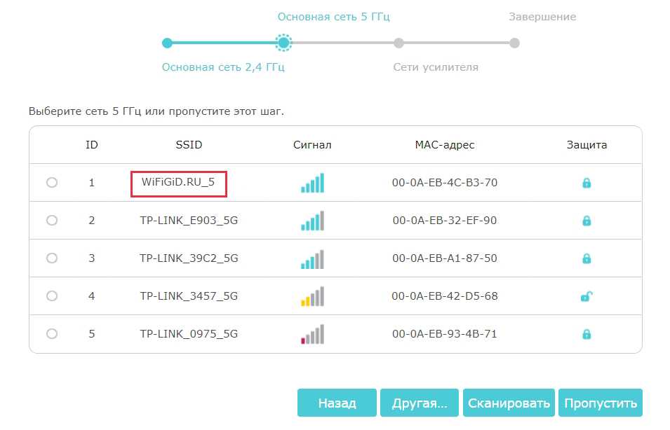 Теперь то же самое делаем с частотой 5 ГГц.Если ваш роутер не раздает сеть на этой частоте, нажимаем кнопку «Пропустить».