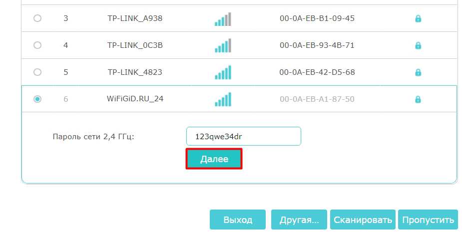 - Из списка найденных соединений потребуется выбрать название своей точки доступа, кликнув по нему левой клавишей манипулятора, и нажать на кнопку «Далее».