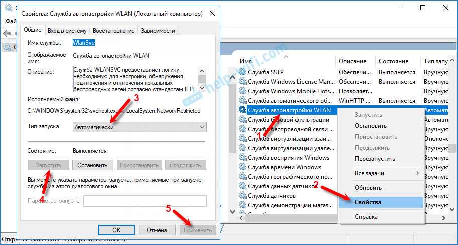В окне находим «Служба автонастройки WLAN», открываем ее свойства, ставим тип запуска «Автоматически», нажимаем на кнопку «Запустить» и «Применить». Они у вас должны быть активны.
