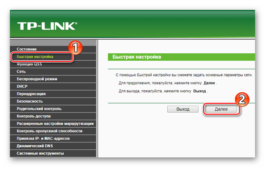 Для потребителей, которые не очень искушены в тонкостях наладки маршрутизаторов, или не хотят слишком заморачиваться, в прошивке TP-Link TL-WR740n имеется функция быстрой настройки. Чтобы запустить ее, нужно перейти в раздел с таким же названием и нажать на кнопку «Далее».