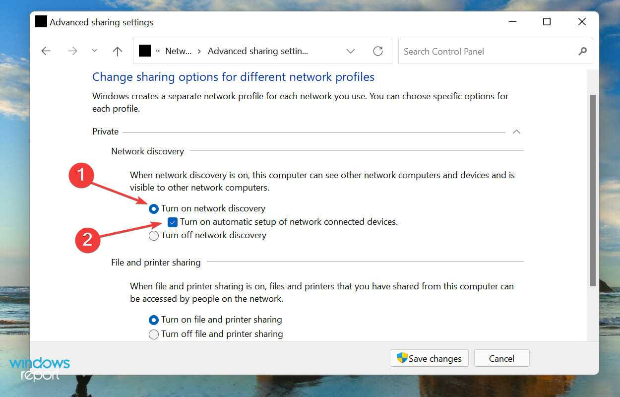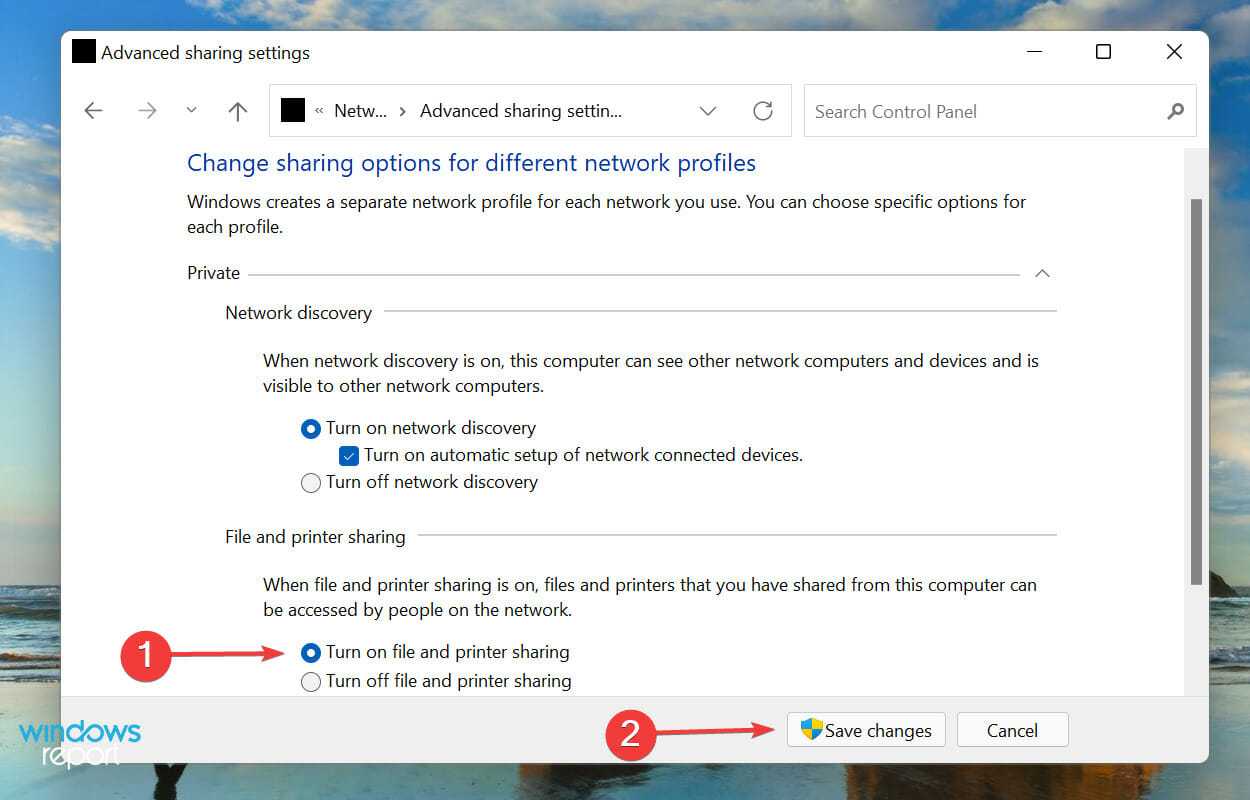 Затем выберите параметр « Включить общий доступ к файлам и принтерам » и нажмите « Сохранить изменения » внизу.