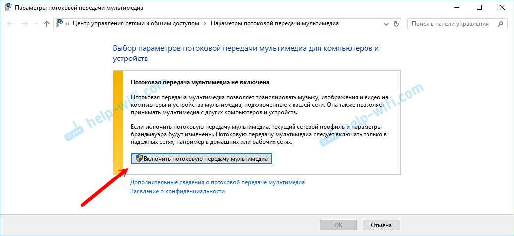 2 В новом окне нажимаем на кнопку «Включить потоковую передачу мультимедиа». Тем самым мы включаем DLNA сервер в Windows 10.
