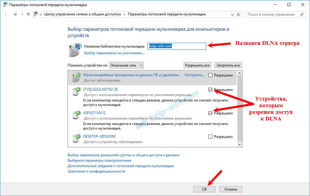 3 Дальше укажите название своего DLNA сервера. Затем, в списке устройств вы можете разрешить, или запретить доступ к медиа-серверу для определенного устройства в вашей сети. Если вы подключены к своей домашней сети, то можете оставить все устройства.