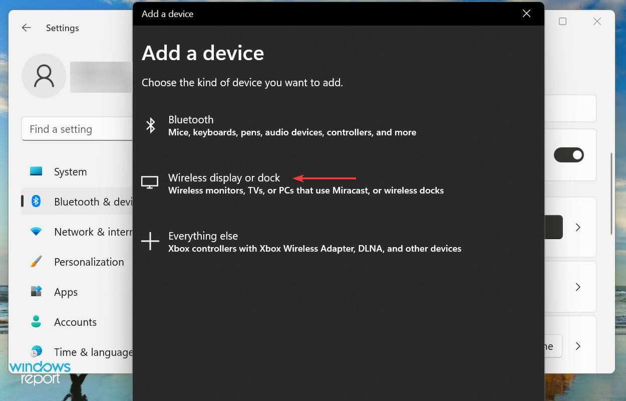 Выберите Беспроводной дисплей или док -станцию из трех вариантов, перечисленных в окне Добавление устройства .