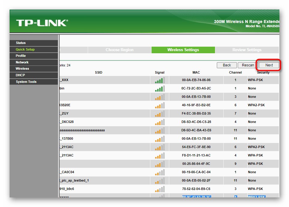 В нем нажмите кнопку «Next» для запуска сканирования доступных беспроводных точек доступа.
