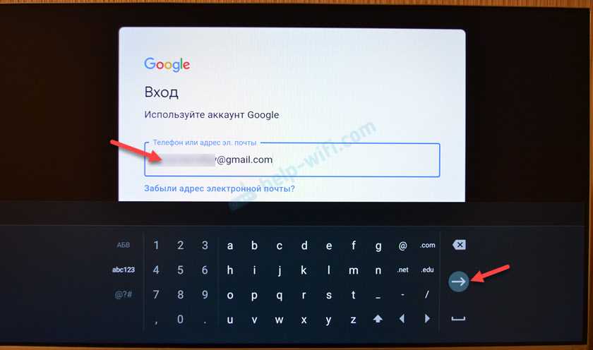 Также можно авторизоваться с помощью пульта дистанционного управления. При выборе этого варианта на экране появляется обычная форма авторизации, где необходимо в соответствующие поля ввести адрес своей Gmail-почты и пароль от нее.
