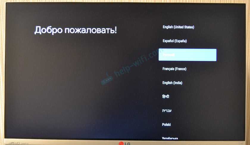 Нажмите кнопку питания на пульте дистанционного управления, чтобы включить устройство. Появится заставка Android, а затем экран «Добро пожаловать». На этом этапе выберете русский язык из предлагаемого списка.