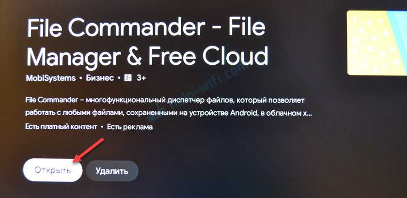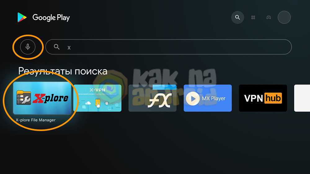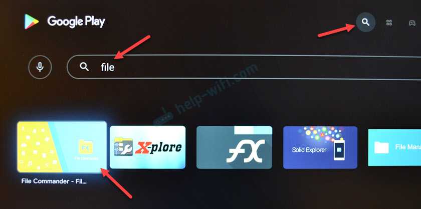 - Откройте на приставке Google Play Store, найдите через поиск и установите приложение File Commander. Можно так же использовать X-plore, или другой файловый менеджер.