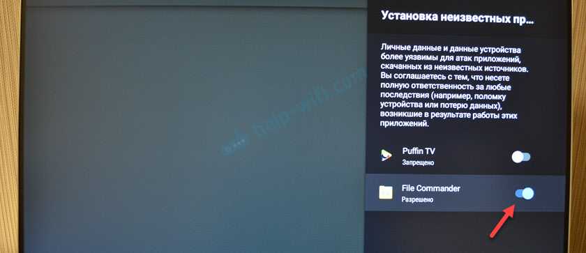 - File Commander пока не запускаем, а переходим в настройки приставки. Откройте раздел «Настройки устройства» – «Безопасность и ограничения» – «Неизвестные источники». И там включаем (разрешаем) наш File Commander. Или другой файловый менеджер, который установлен у вас. Этим мы разрешаем установку приложений через данный файловый менеджер.