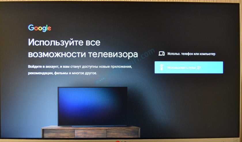 - Авторизоваться в аккаунте можно с помощью смартфона или компьютера, который подключен к этой же Wi-Fi сети и на котором уже выполнен вход в этот аккаунт. Для этого необходимо открыть в любом браузере указанную на экране телевизора страницу androidtv.com/setup и ввести специальный проверочный код, указанный внизу экрана.