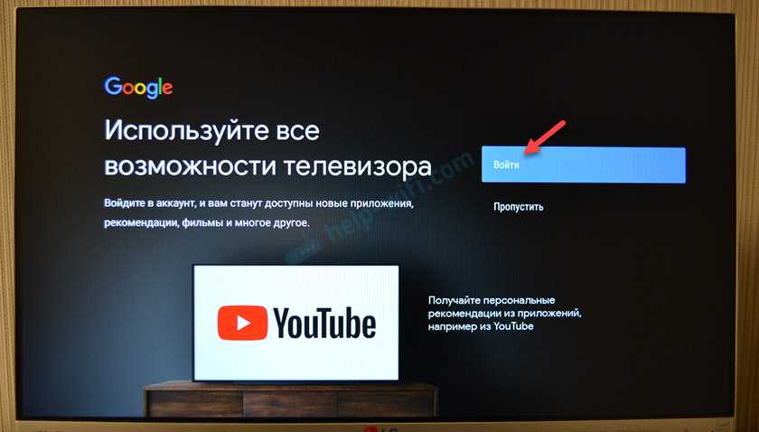 Дальше нам предложат выполнить вход в аккаунт Google. И я настоятельно рекомендую это сделать. Чтобы была возможность пользоваться всеми функциями. Автоматически будет выполнен вход в аккаунт YouTube. Так же вы сможете устанавливать приложения из Play Маркет. В принципе, этот шаг можно пропустить и зайти в свой аккаунт Google позже в настройках, но я рекомендую сделать это сразу.