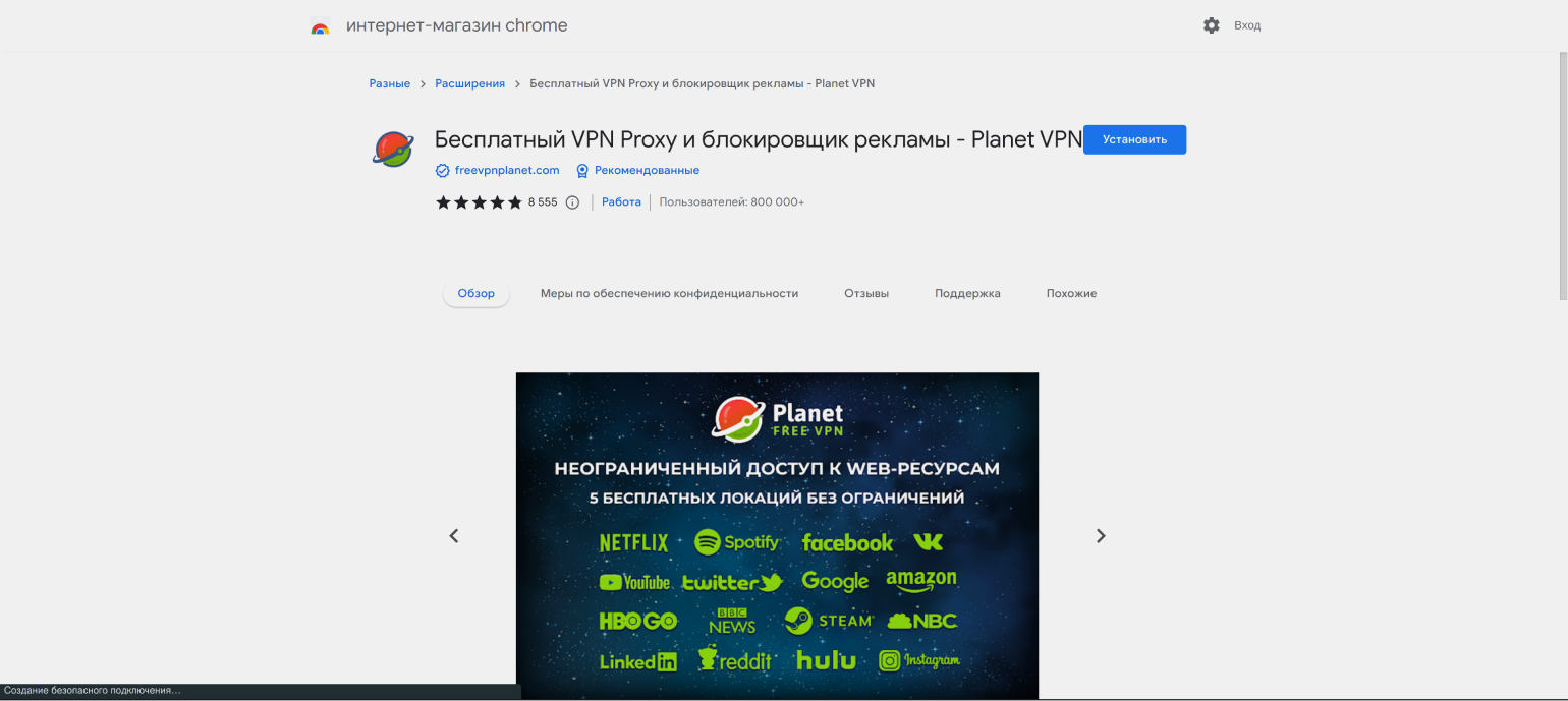 В окне конкретного плагина нажмите на кнопку Установить для установки VPN в ваш браузер: