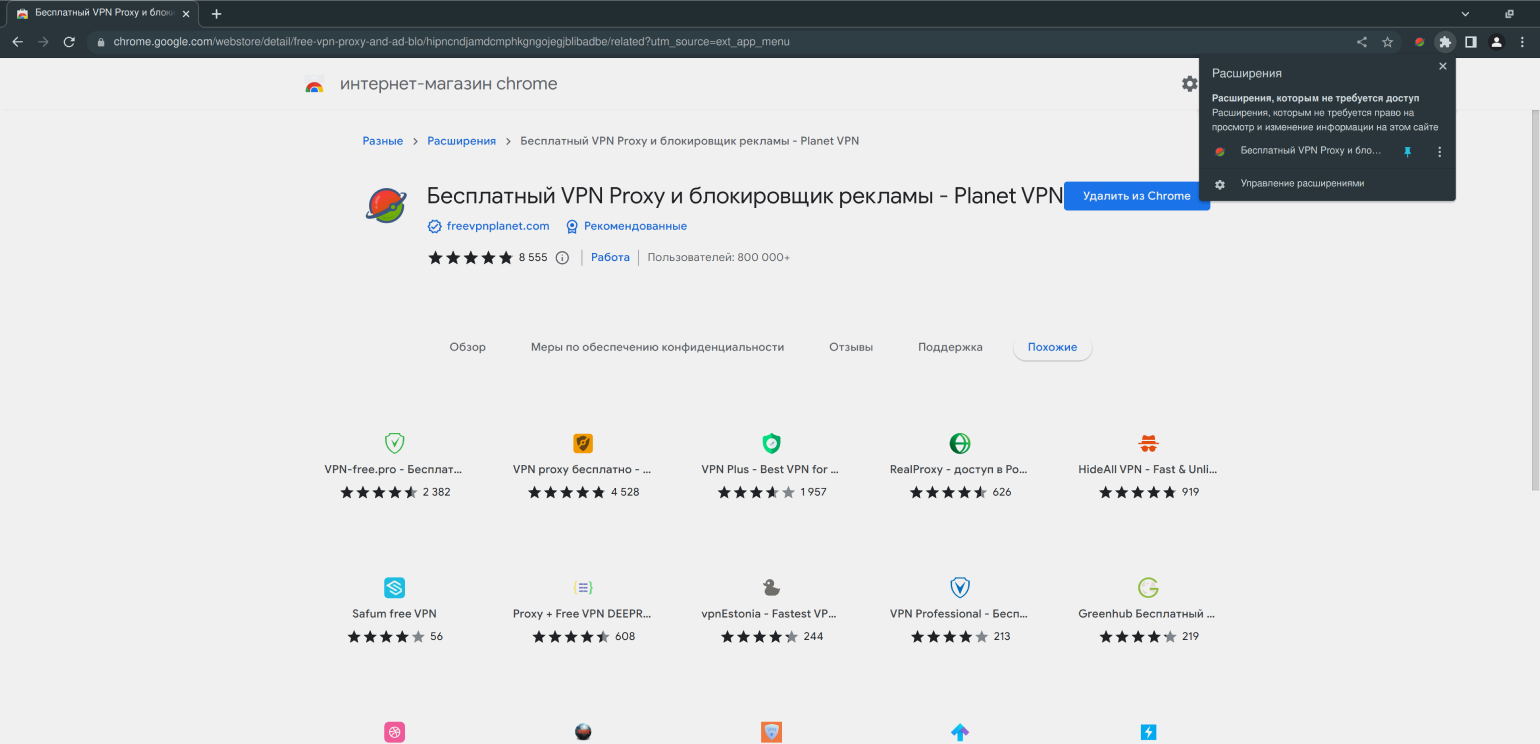 Если другие расширения с функцией VPN или прокси не отключаются автоматически при обнаружении FastProxy, их следует удалить, чтобы браузер работал корректно. Кроме того, надо разрешить рассматриваемому плагину доступ ко всем сайтам через меню дополнительных настроек. Единственный недостаток ручной инсталляции – это невозможность обновлять дополнение автоматически.