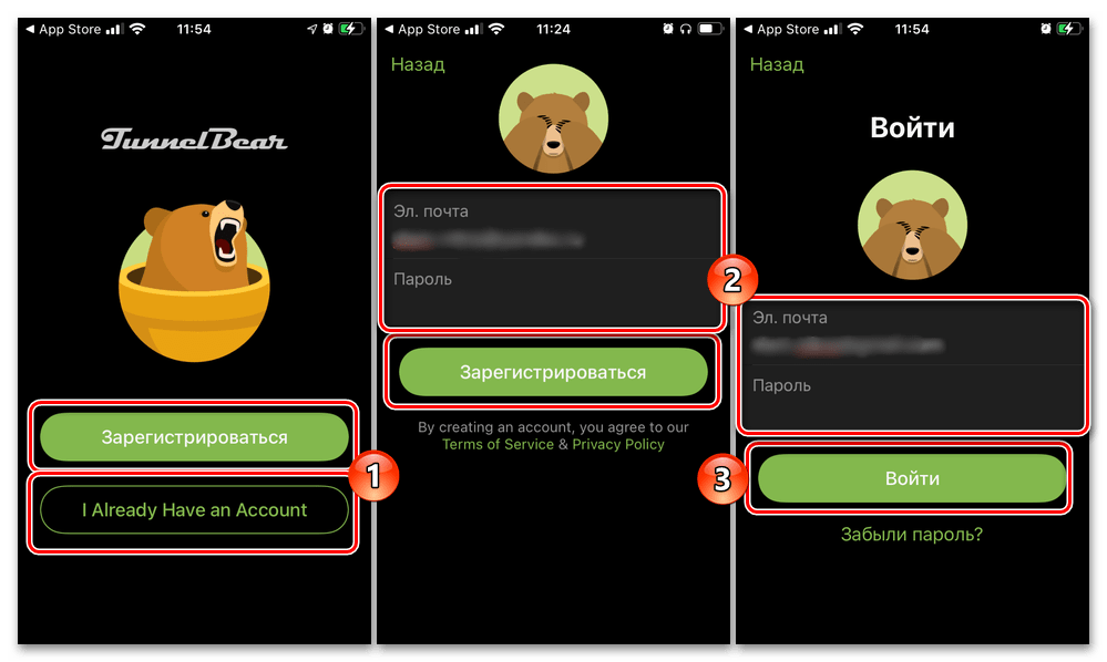 Если ранее вы никогда не использовали TunnelBear, в нем потребуется «Зарегистрироваться» — ввести электронную почту и придумать пароль. В случае если у вас уже есть аккаунт, для того чтобы «Войти» в него, нажмите «I Already Have an Account», укажите логин и пароль.