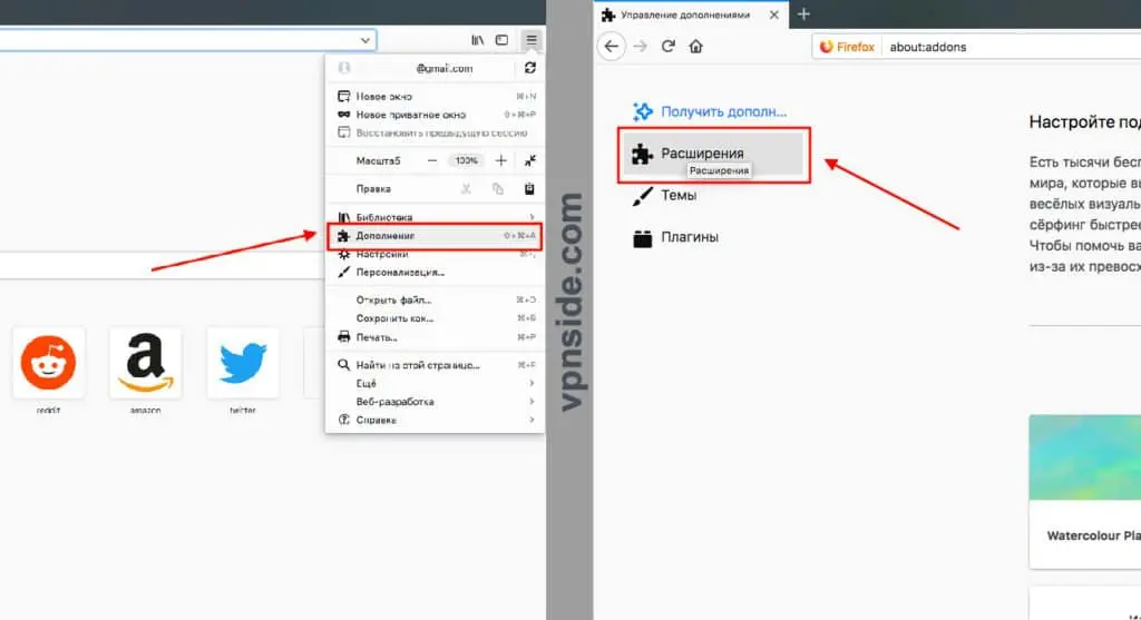 В браузере Mozilla Firefox можно установить расширения, просто перейдя в «Меню» и там выбрать «Дополнения». На вкладке «Расширения» вы сможете найти VPN-сервисы.