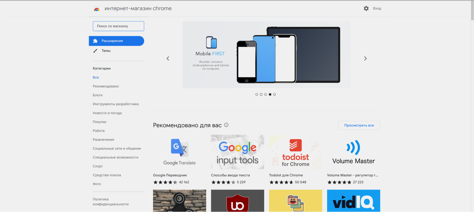 - Перейти на главную страницу магазина дополнений для Хрома.