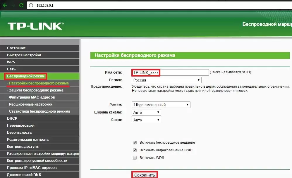 Для этого на роутерах TP-Link в базовых настройках Вай-Фая смотрим стоит ли галочка «Включить широковещание SSID»: