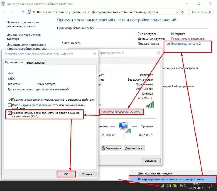 Откройте “Центр управления сетями и общим доступом” и нажмите на свою Wi-Fi сеть. В новом окне нажимаем на кнопку “Свойства беспроводной сети” и ставим галочку возле “Подключаться, даже если сеть не ведет вещание своего имени (SSID)”. Нажимаем Ok.