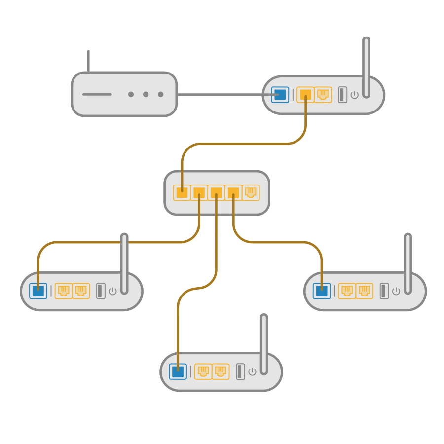 Используйте главный AiMesh роутер или сетевой коммутатор подключенный к терминалу провайдера в качестве точки соединения всех узлов. Для обеспечения наилучшую производительность Mesh сети, используйте коммутатор поддерживающий 10/100/1000, сетевой кабель (RJ45) соответствующий спецификации CAT5e или выше.