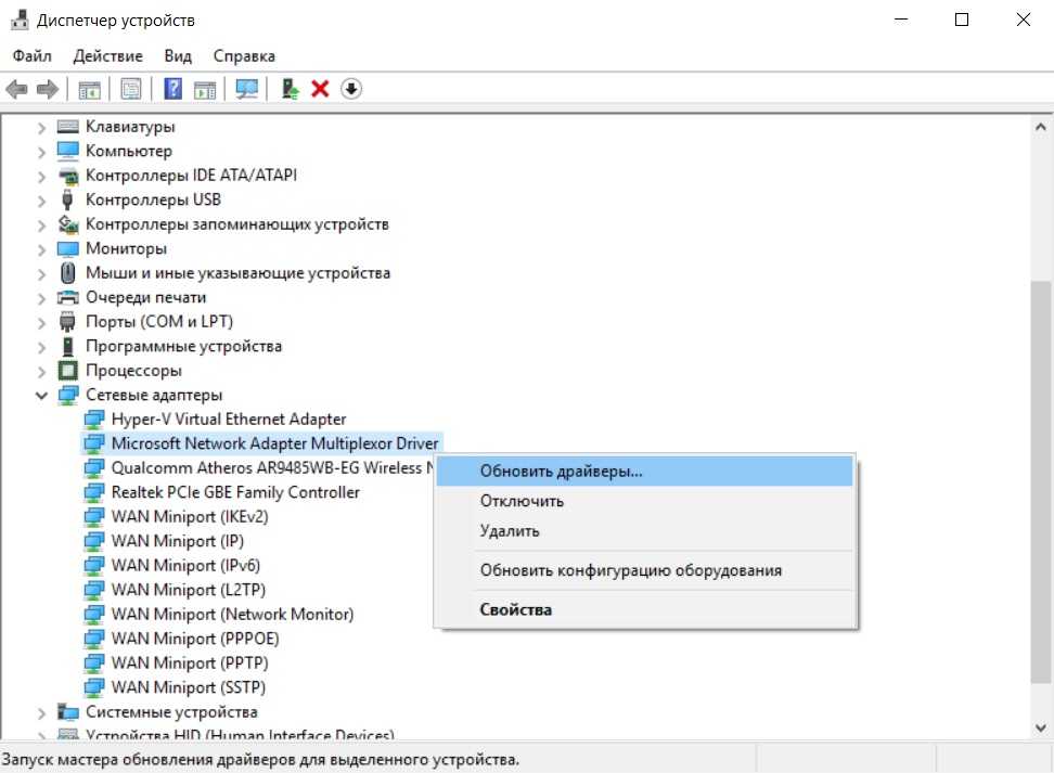 Развернуть список «Сетевые адаптеры» и определить нужный – в нем обязательно будут слова Wireless или Wi-Fi – щелкнуть правой кнопкой и выбрать «Обновить драйверы».