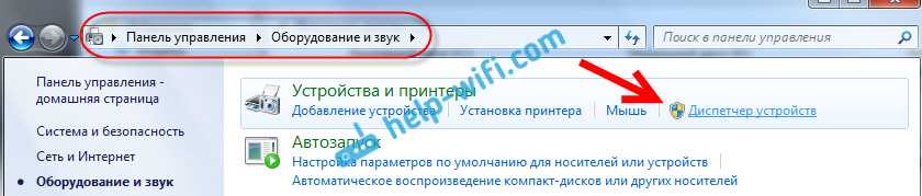 Можно еще зайти в диспетчер устройств, и посмотреть, есть ли там адаптер беспроводной сети, и как он работает. Что бы открыть диспетчер устройств делаем так: заходим в Пуск, затем Панель управления. Выбираем раздел Оборудование и звук. На вкладке Устройства и принтеры нажимаем на Диспетчер устройств.