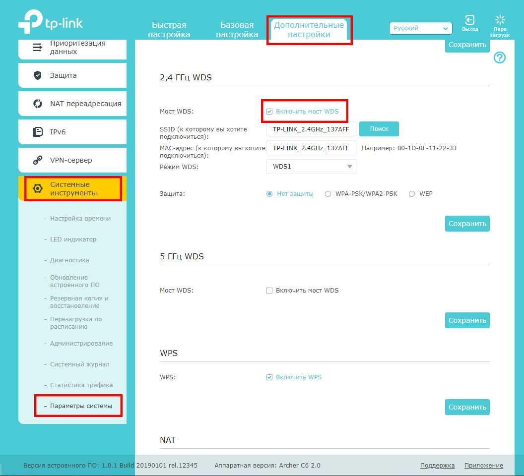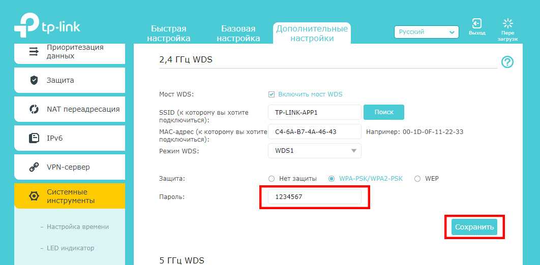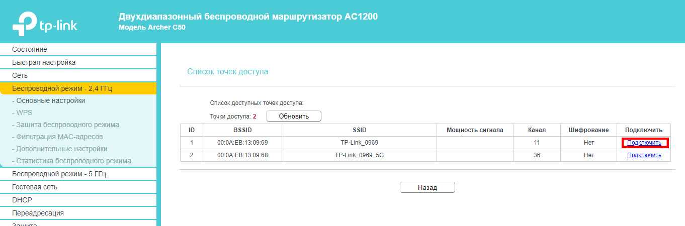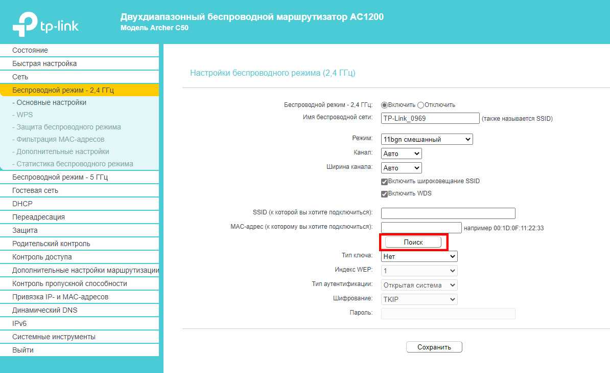 В заводском варианте настройки уже установлены оптимальные параметры сети Wi-FI на TP-Link Archer C5: задано индивидуальное имя сети, установлен уникальный и достаточно сложный пароль. При необходимости всегда можно изменить эти настройки WI-FI через раздел «Дополнительные настройки» ⇒ «Беспроводной режим». Там для каждого из диапазонов надо выбрать затем выберите пункт меню «Настройки беспроводного режима».